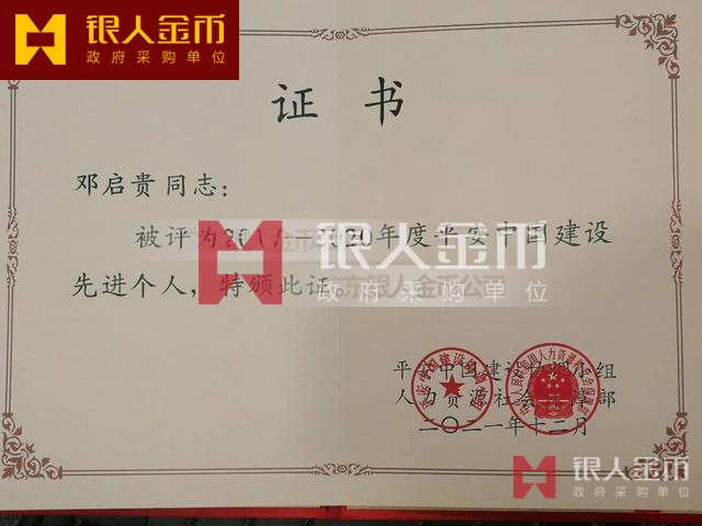 人社部平安中國建設工作領導小組頒發的人社部平安中國建設示范省市縣地州盟旗先獎牌和先進個人獎章證書(圖)
