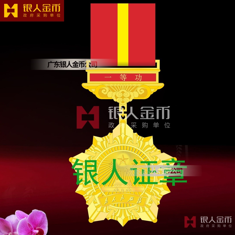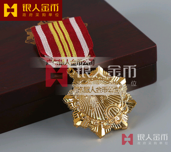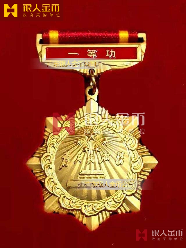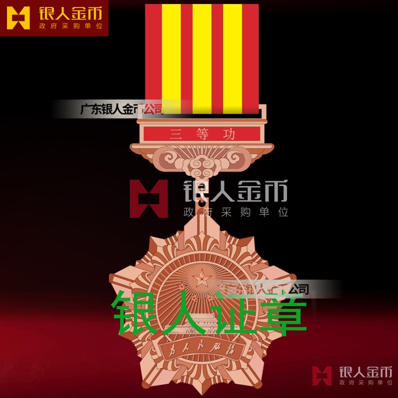 一、二、三等功獎?wù)掠摄~壓制成型,分別采用鍍金、銀、銅工藝。核心區(qū)上部為五星圖案;中部為天安門圖案;下部為毛澤東同志書寫的“為人民服務(wù)”字樣,采用紅色填釉工藝;核