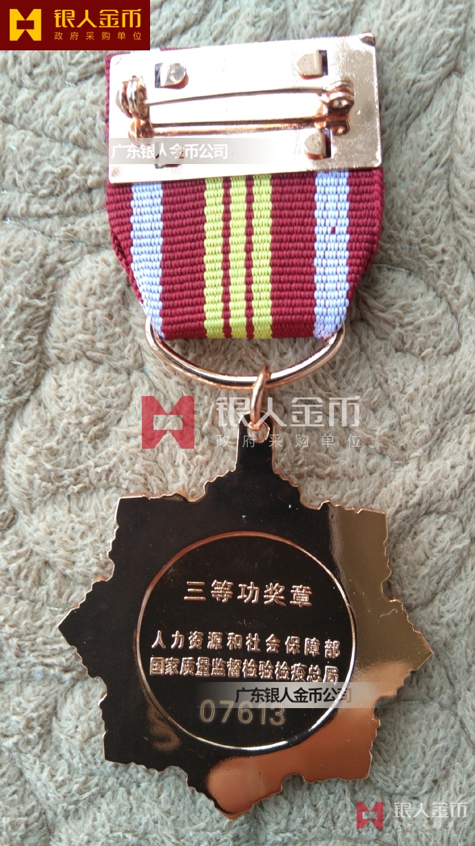 別為齒輪和綢帶圖案;外圈為五角光芒;上章鐫刻獎項(xiàng)名稱,分別標(biāo)明一、二、三等功,采用紅色填釉工藝。獎?wù)卤澈髽?biāo)明監(jiān)制機(jī)關(guān)名稱。綬帶為絲質(zhì),大紅色,分別用一條、二條