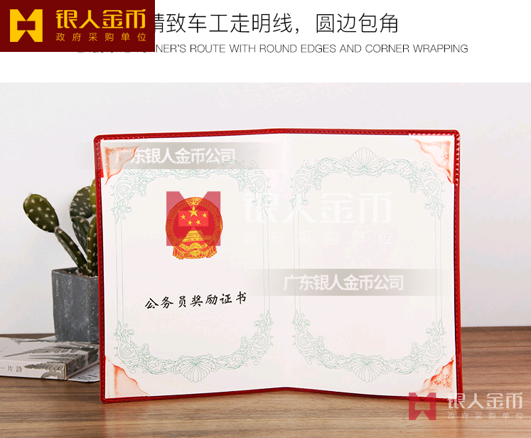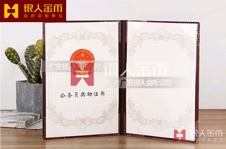本證書適用于對公務(wù)員、公務(wù)員集體的獎勵。證書規(guī)格為410×290毫米(展開)。封面選用國旗紅色絲綢材料,燙金印制國徽圖案及“公務(wù)員獎勵證書”字樣,字體為魏碑,54號字,