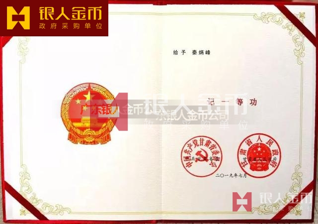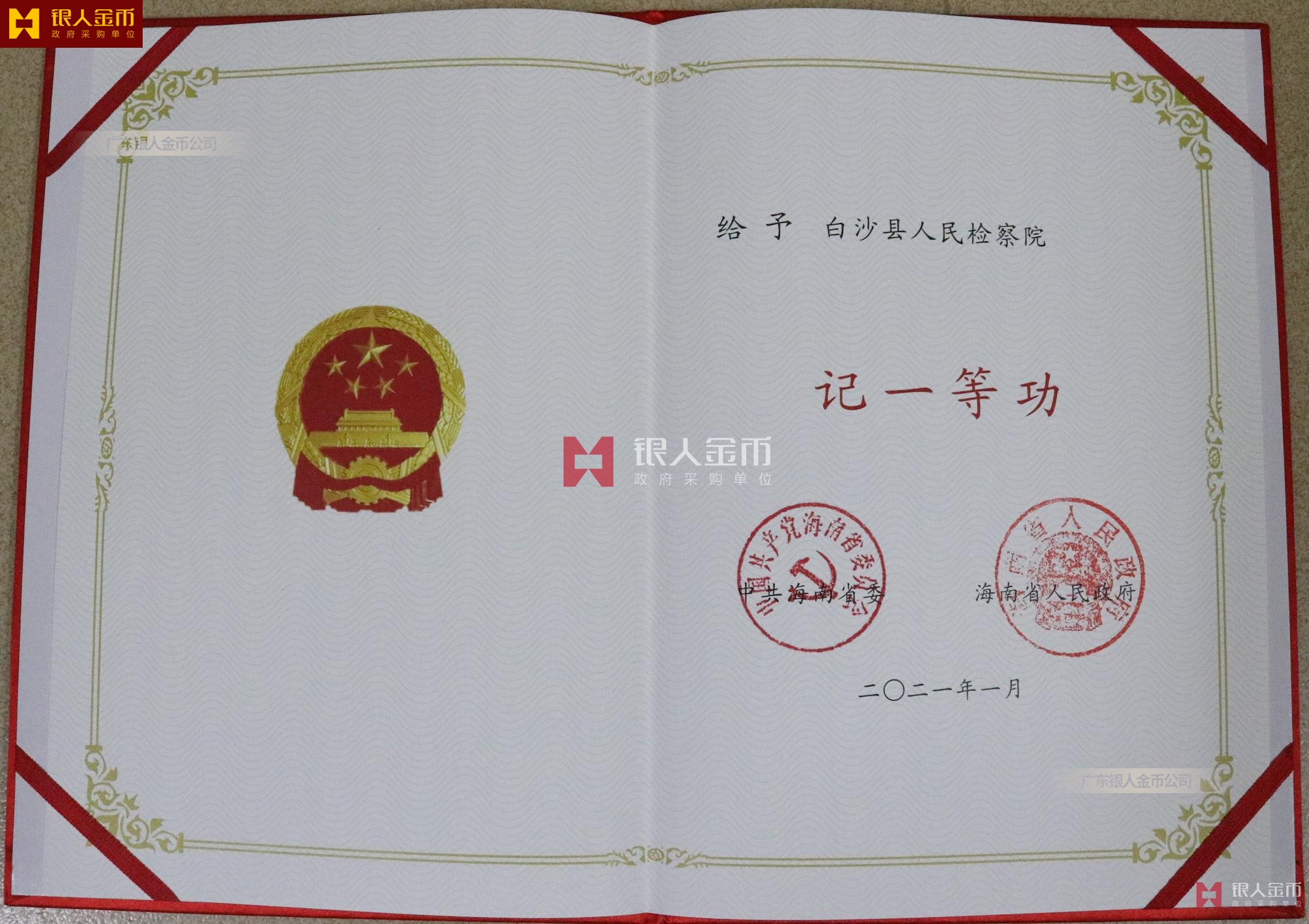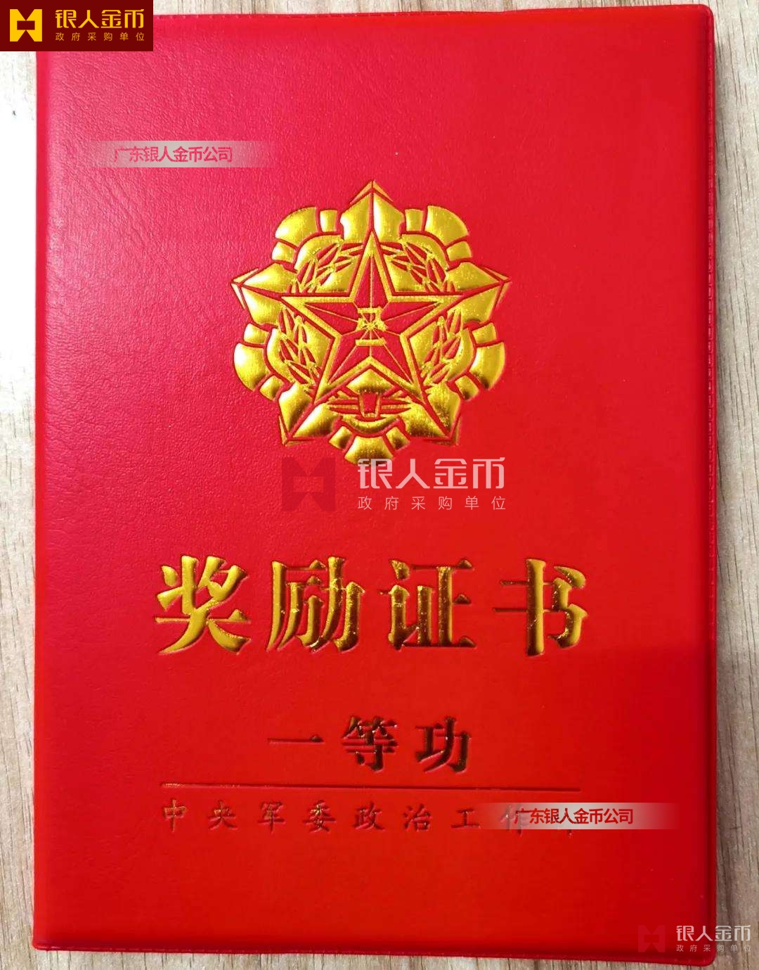 規(guī)格為430×270毫米,正中上方為一枚金屬材質(zhì)國徽,規(guī)格為75×80毫米;左上部分為獲獎單位名稱,中間部分為受到何種獎勵,右下部分為頒獎單位名稱和頒獎日期。