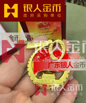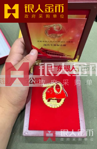 設計元素一五星紅旗、天安門、華表、長城、祥云、70字樣。材料工藝一鋅合金壓鑄工藝,徽體表面采用24K鍍金,國旗采用紅色瓷漆噴漆工藝。
