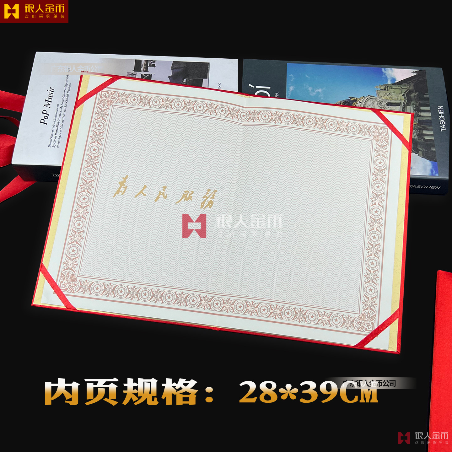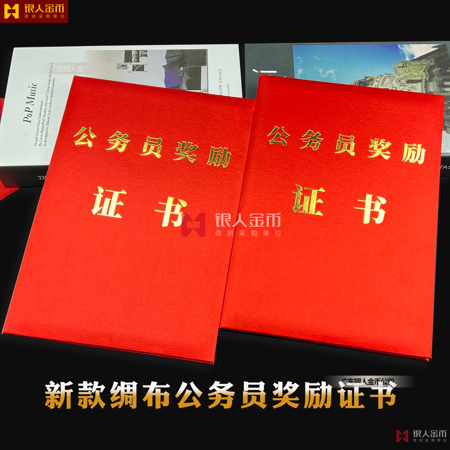 本證書適用于對公務員、公務員集體的獎勵。證書規(guī)格為410×290毫米(展開)。封面選用國旗紅色絲綢材料,燙金印制國徽圖案及“公務員獎勵證書”字樣,字體為魏碑,54號字,國徽圖案規(guī)格為80×84毫米。內頁為硬卡紙,淺黃色,金色波浪底紋,周邊配以纏枝紋圖案。左側印制國徽圖案,規(guī)格為75×80毫米。右側為正文,其中左上部分為獲獎單位或個人名稱,中間部分為受到何種獎勵,右下部分為頒獎單位名稱、印章和頒獎日期。