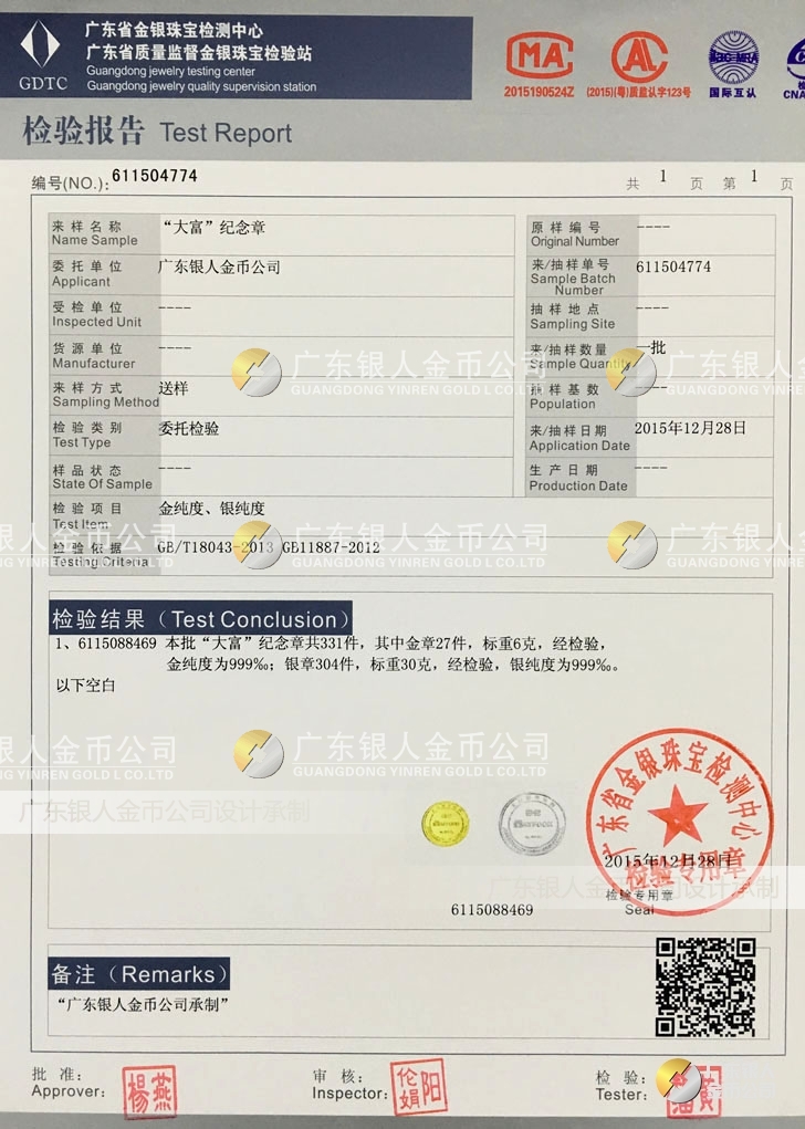 廣東銀人金幣公司承接客戶個性化定制的金銀幣、金銀章、金銀條、金銀牌、金銀盤均由國家質(zhì)監(jiān)部門、嚴格檢測、權(quán)威鑒定: