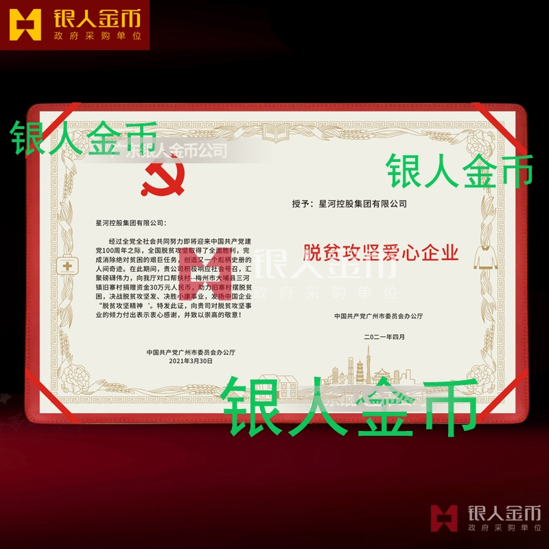 【證書制作】 廣東銀人金幣公司-榮譽證書制作廠家