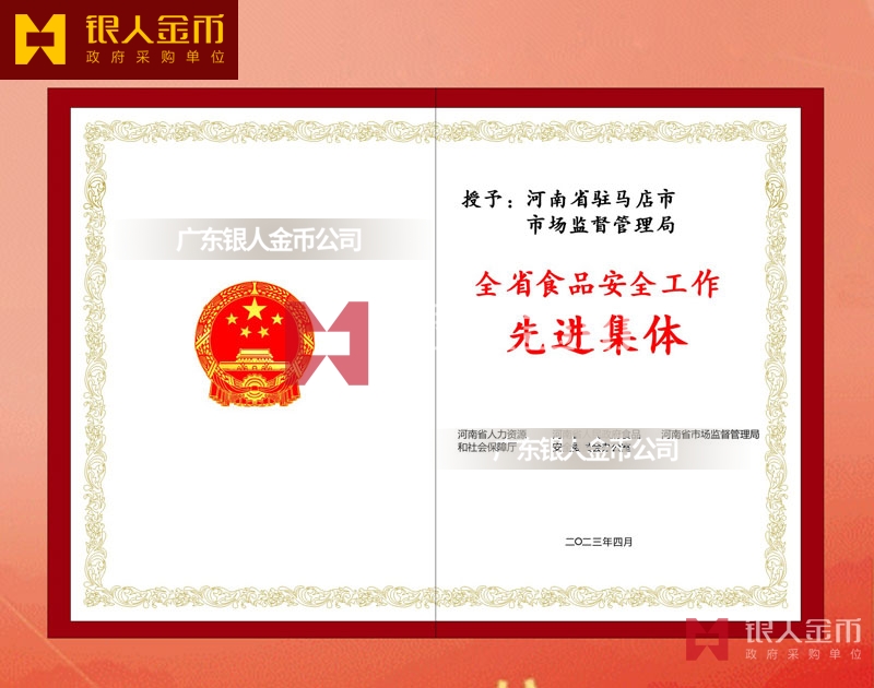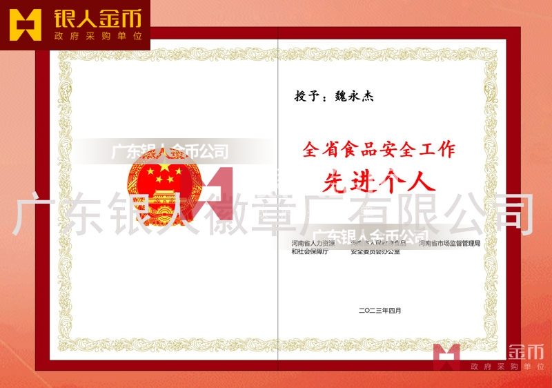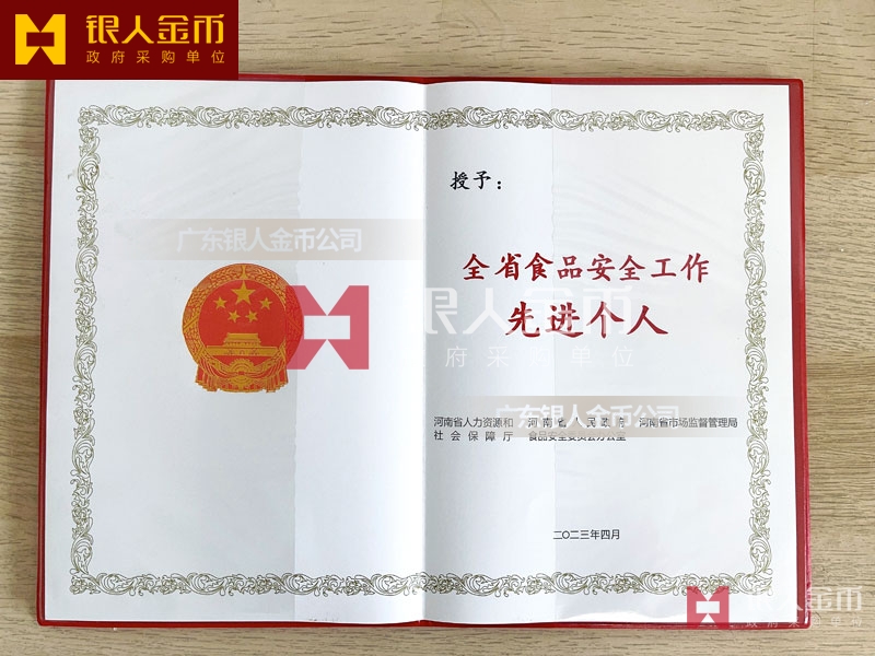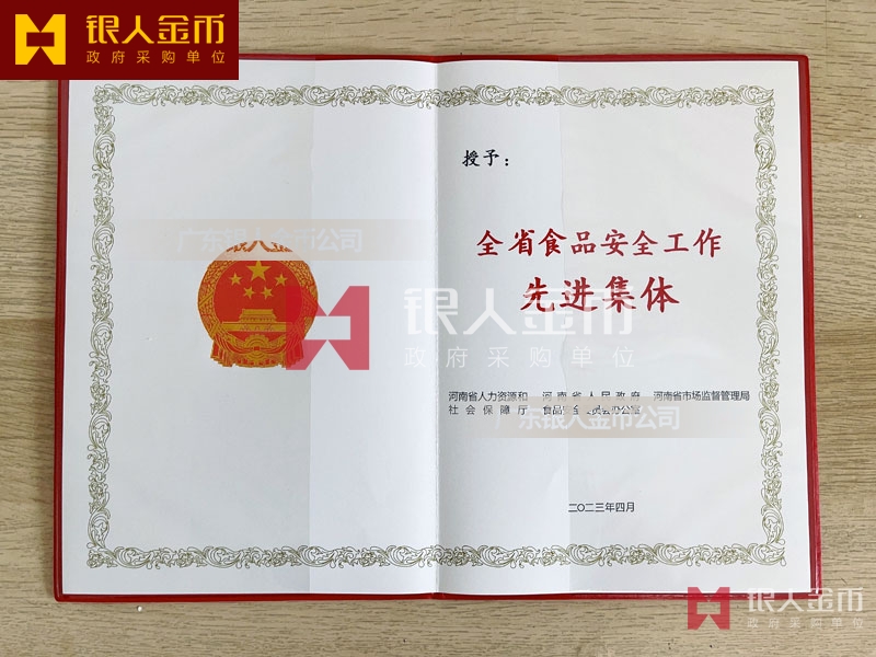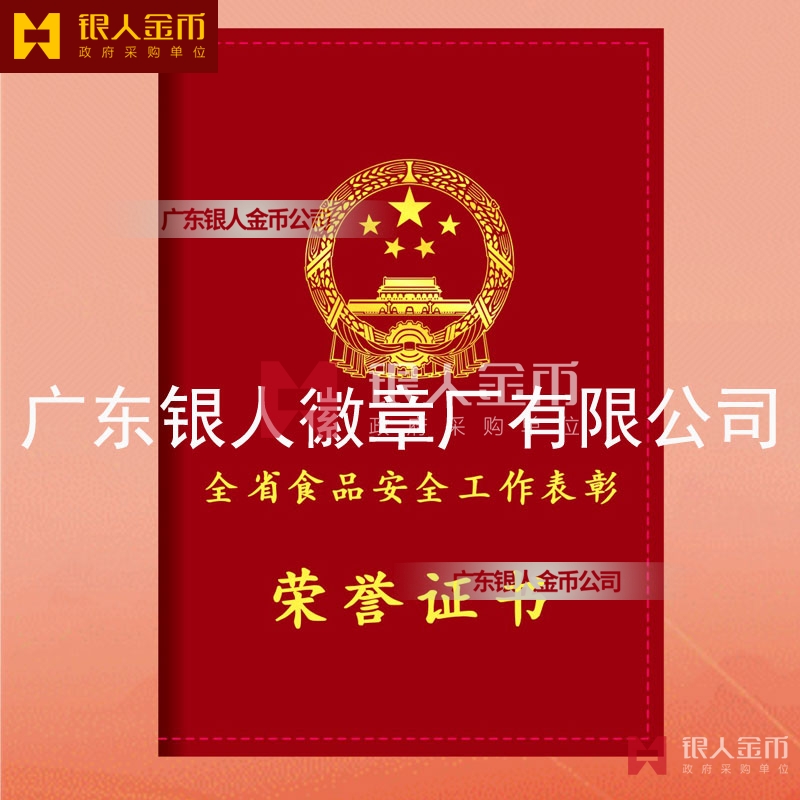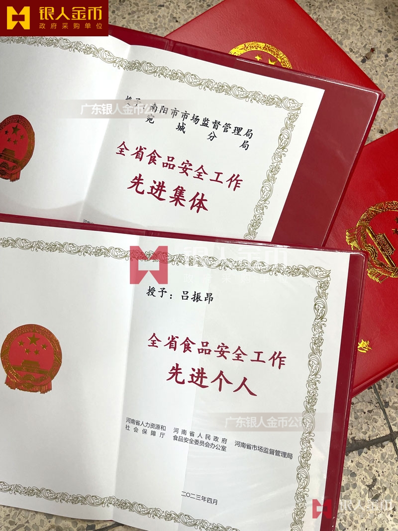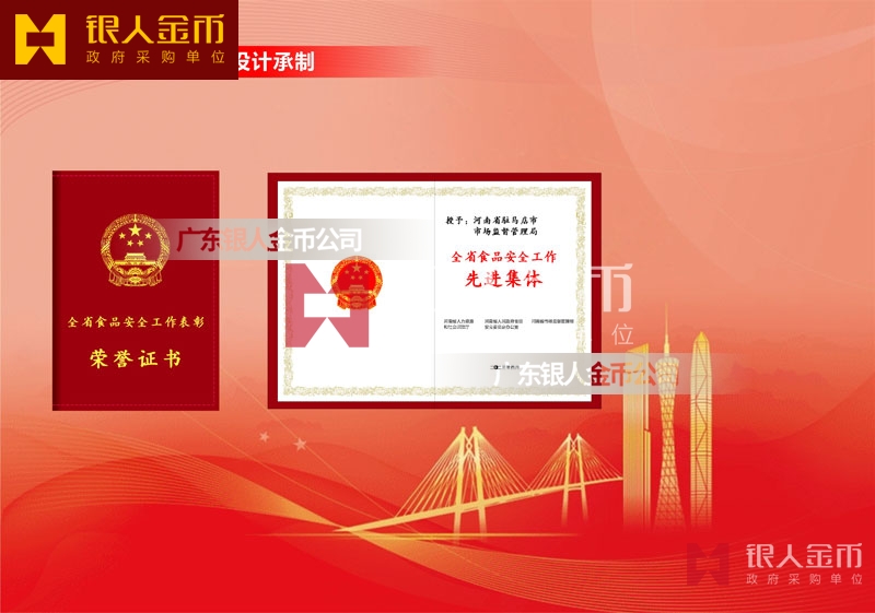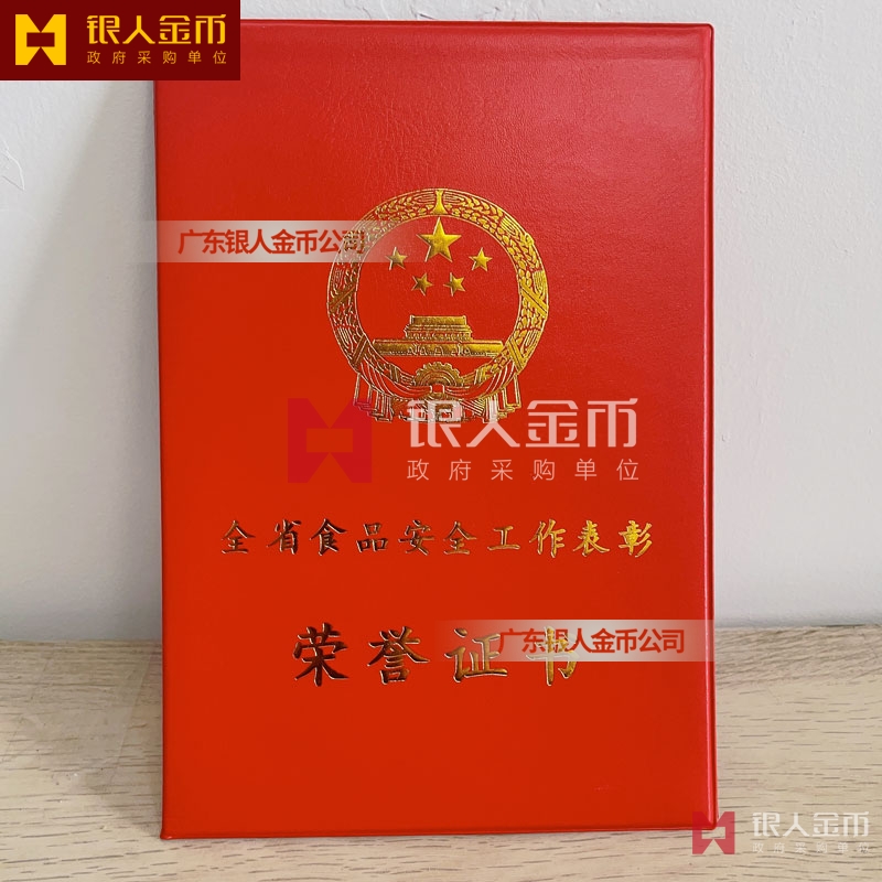 河南省政府全省食品安全工作表彰獎勵證書定制制作_河南省人力資源和社會保障廳獎勵表彰榮譽證書定做_河南省市場監(jiān)督管理局榮譽獎勵表彰證書訂制